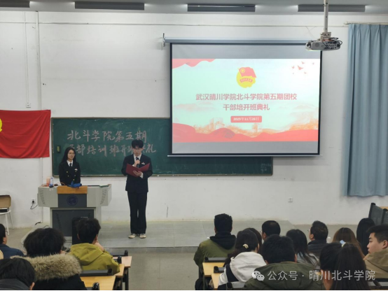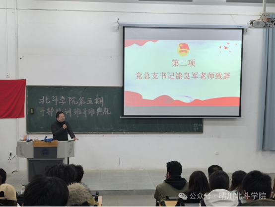 为强化团干部责任担当,助力青年学子成长成才,我院第五期团校干部培训班开班典礼于11月26日在教4-113教室如期举行。北斗学院党总支书记漆良军书记,团总支书记李晓嫚老师,学生党支部书记阳军老师及辅导员钱晓东老师出席活动,团校全体成员与学生会全体成员共同参与此次培训。
