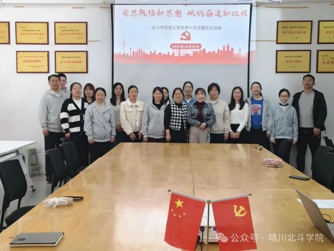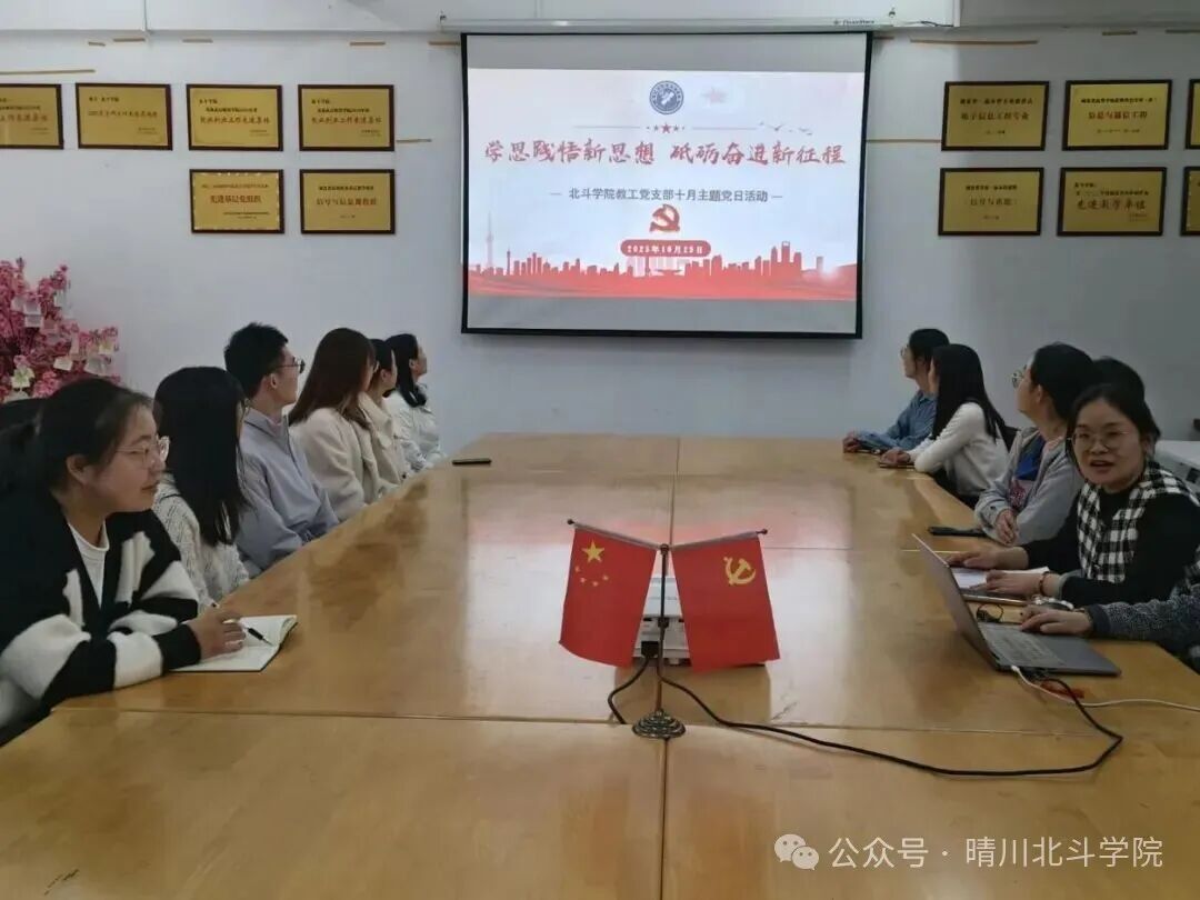 为深入贯彻落实中央有关精神,根据中共湖北省委组织部和省委教育工委要求,结合学校有关工作安排,北斗学院教工党支部于 10 月 29 日下午 12 点 30 分在综 1-203开展了以“学思践悟新思想 砥砺奋进新征程”为主题党日活动。本次活动由北斗学院教工党支部书记曾蓉同志主持,北斗学院全体教工党员出席参加。大会围绕学习习近平总书记在听取新疆维吾尔自治区党委和政府工作汇报时的重要讲话、学习习近平总书记在中共中央政治局第二十二次集体学习时重要讲话、学习习近平总书记重要文章《中华民族共同体的形成和发展是人心所向、大势所趋、历史必然》、学习习近平总书记在庆祝中华人民共和国成立 76 周年招待会上的讲话展开。
